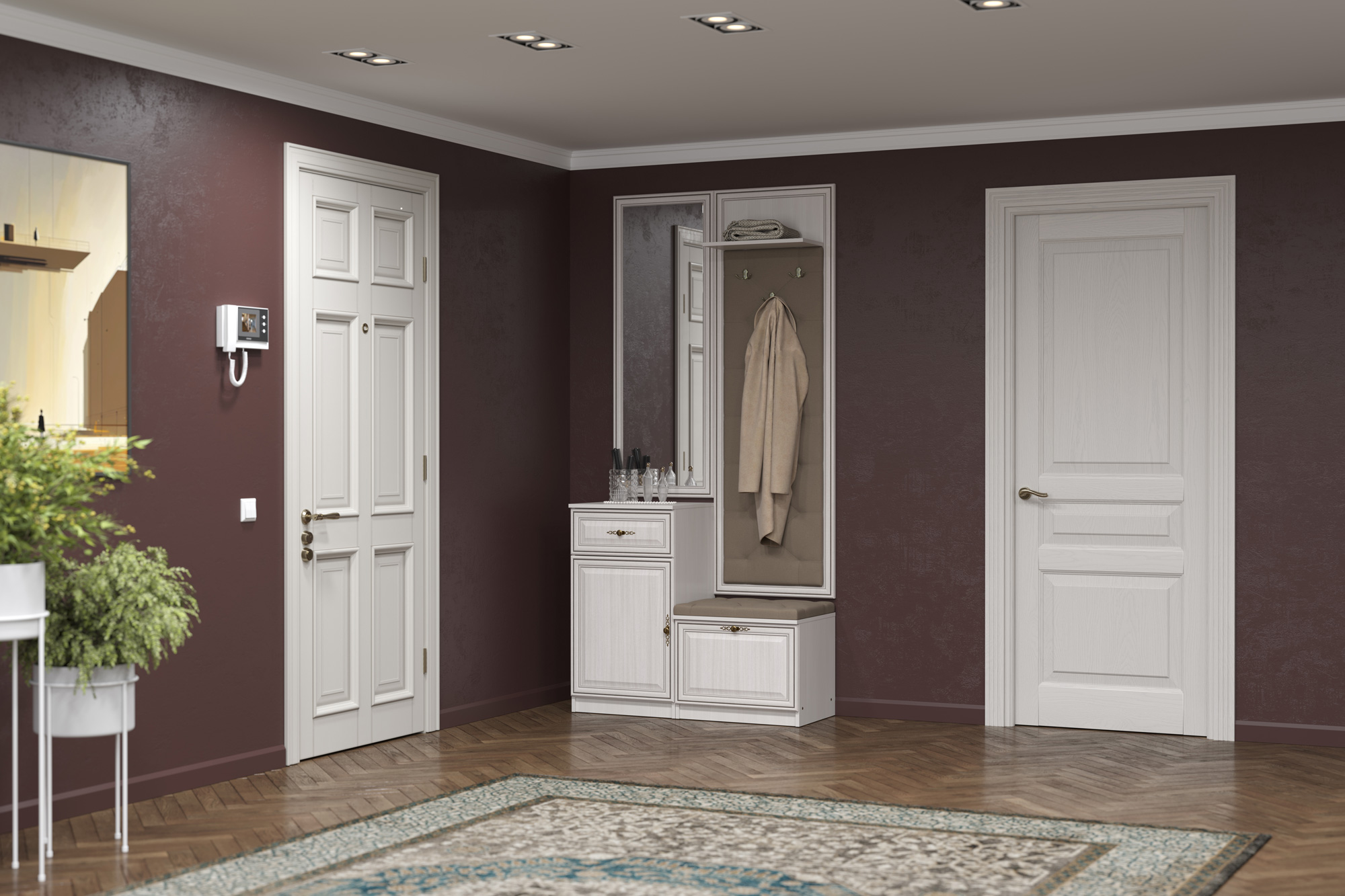 Прихожую комнату следует оснастить вешалкой с полками и зеркалом. При этом потребуются полки не только под шапки, рукавички, но и под обувь. Прогрессивное оснащение — современный, вместительный шкаф-купе. В каждом индивидуальном случае прихожую можно дополнить требующимися предметами: лавочками, табуретками, трюмо с зеркалом.